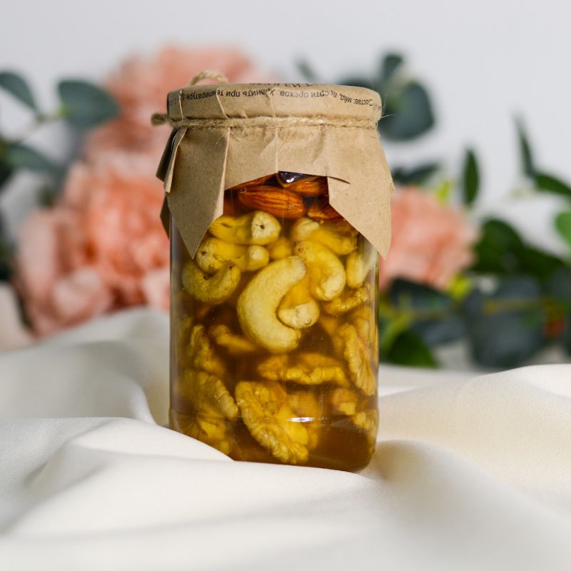 Натуральное ассорти орехов в меду - это природный витаминный коктейль для крепкого здоровья, бодрости и отличного настроения, созданный из вкусных и полезных продуктов. Орешки, пропитанные свежим медом и вобравшие в себя его нежный аромат и вкус, отлично подходят, чтобы полакомиться, быстро утолить голод и при этом насытить организм всеми необходимыми веществами.