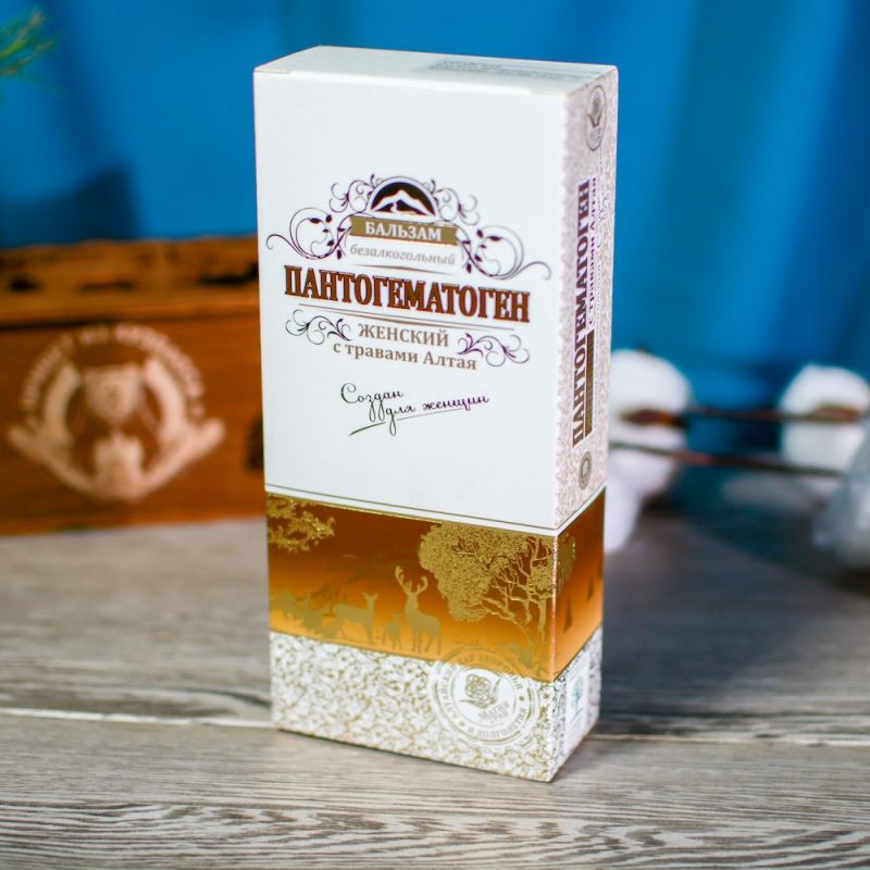 Бальзам «Пантогематоген» Женский рекомендуется в качестве иммуномодулирующего и адаптогенного средства. Сочетание пантогематогена и трав способствуют омоложению организма, улучшению обмена веществ и повышению жизненного тонуса. — активизирует защитные силы организма и иммунную систему, повышая его защитные функции — способствует омоложению организма, активизирует энергетический обмен — повышает умственную и физическую работоспособность — ускоряет процесс заживления ран, уменьшает последствия после перенесенных заболеваний и травм, вызванных физическими перегрузками — улучшает половую потенцию — способствует более быстрой адаптации к смене времен года, перемены климата. Состав: сухая кровь Алтайского марала, корень красной щетки, трава боровой матки, душицы, лист бадана, брусники, плоды рябины, боярышника, шиповника, черемухи, вода очищенная, сахар, сорбат калия.