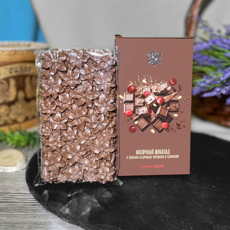 Молочный шоколад "Таёжная легенда"— нежный и обволакивающий, с идеальным балансом сладости, хрустящими кедровыми орешками и яркими вкраплениями клюквы.