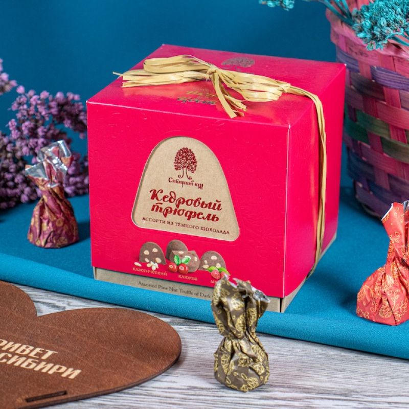 Кедровый трюфель с ядром кедрового ореха- шоколадные конфеты с цельными кедровыми орешками, обсыпанные какао-порошком. Совершенное сочетание трюфеля, кедрового ореха и какао.