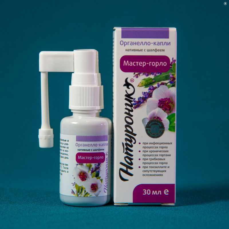 «Натуроник»® органелло-капли нативные с шалфеем Мастер-горло спрей – специально разработанная формула на основе капельной формы микроструктур сока зелёной части и корней растений, биогенных концентратов природных компонентов, направленная на источники воспалительного процесса горла и гортани вирусного, бактериального, грибкового происхождения, сопутствующие осложнения, активность иммунных клеток, очистительные процессы крови и лимфы, слизистых оболочек.