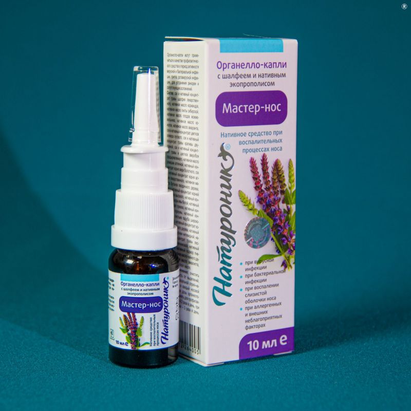 «Натуроник»®, органелло-капли с шалфеем «Мастер-нос» – природные органические капли на основе нативных масел лекарственных растений, биоактивного прополиса и мицелл сока шалфея, оказывающие комплексное противовирусное и антибактериальное действие на возбудителей вирусной и бактериальной инфекции лор-органов, регулирующее действие при сопутствующих нарушениях функций и состояния слизистой оболочки носа и органов дыхания, способствующие нормализации вазомоторных реакций на внешние раздражающие и аллергические факторы.