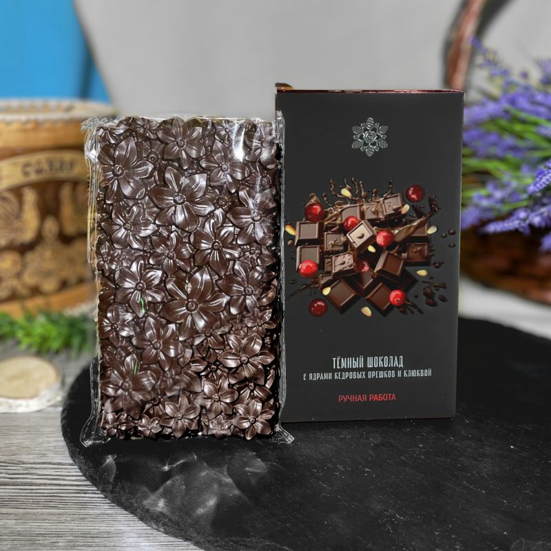 Тёмный шоколад "Таёжная легенда" — глубокий, насыщенный вкус с благородной горчинкой, подчёркивающей натуральность кедровых орехов и сочную свежесть клюквы.